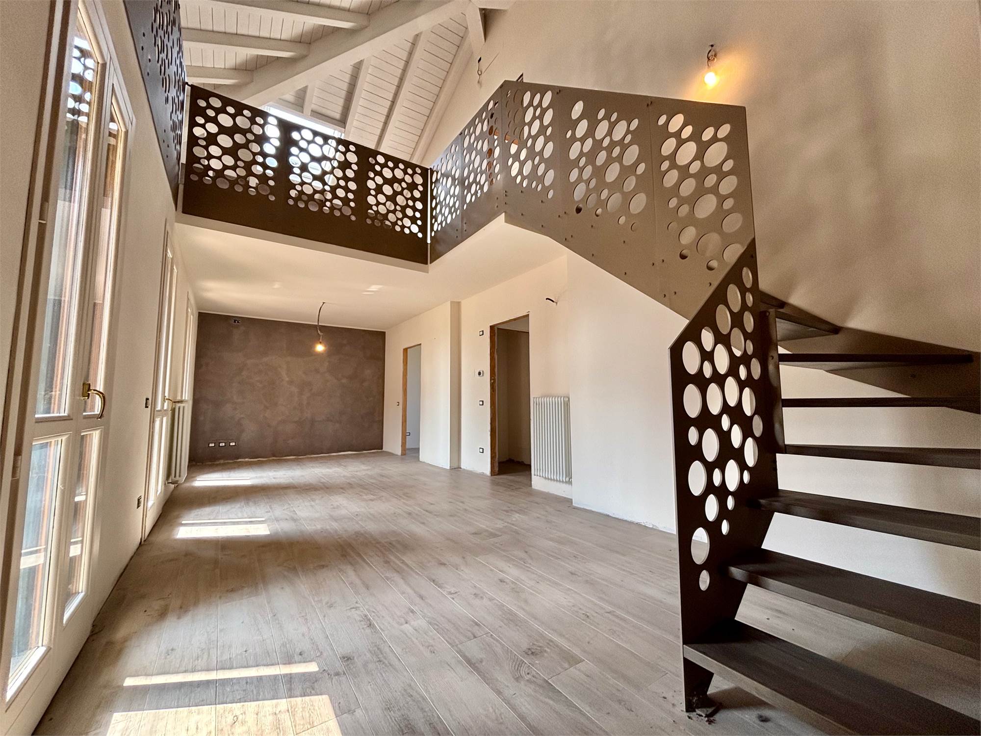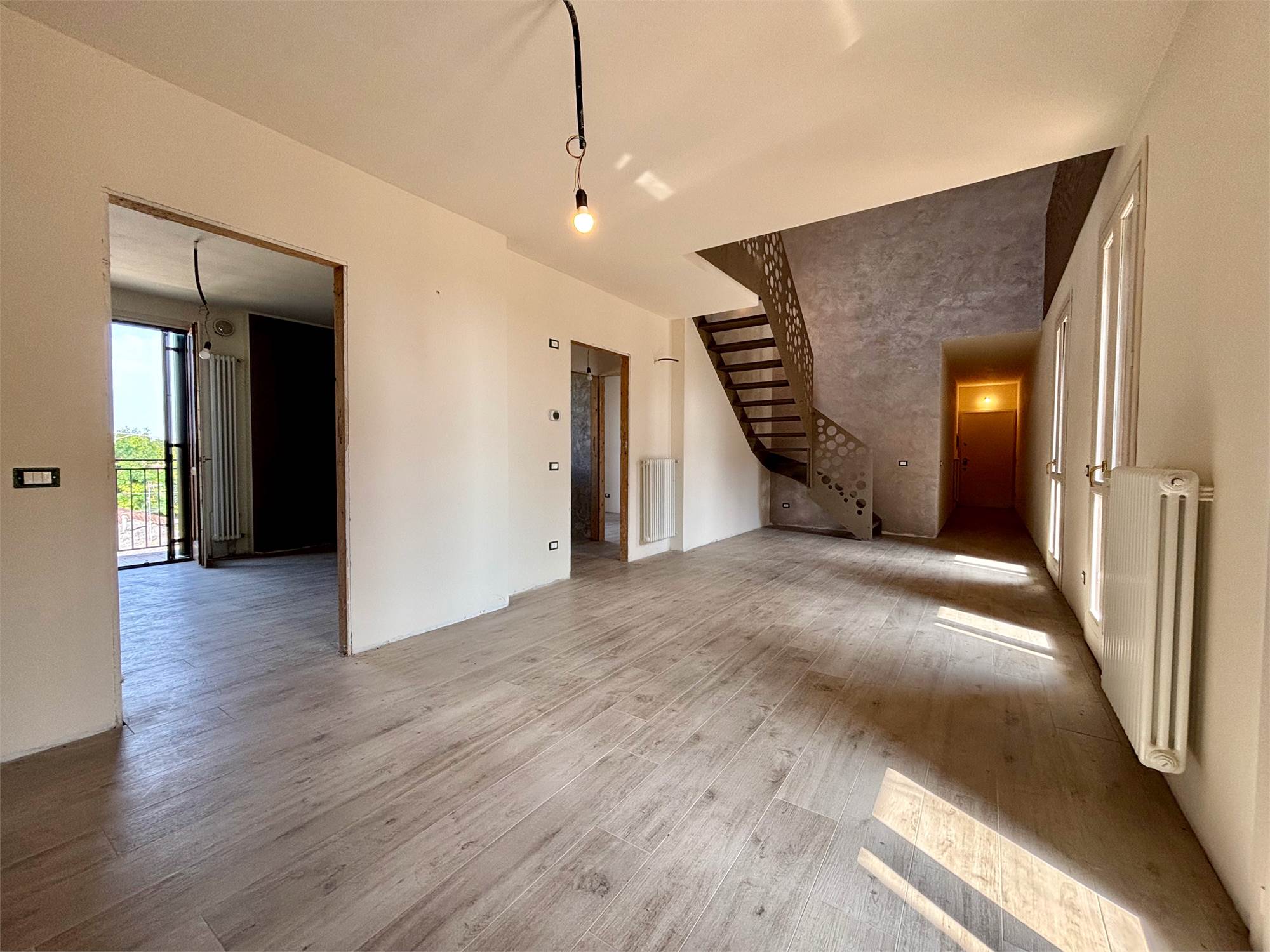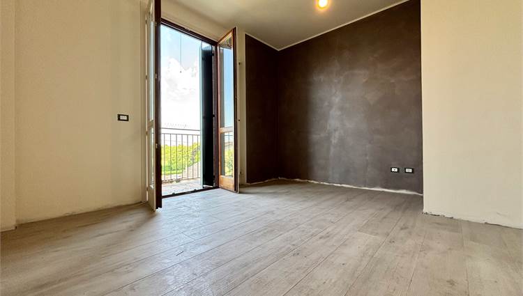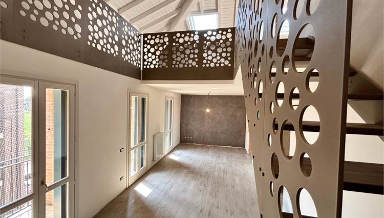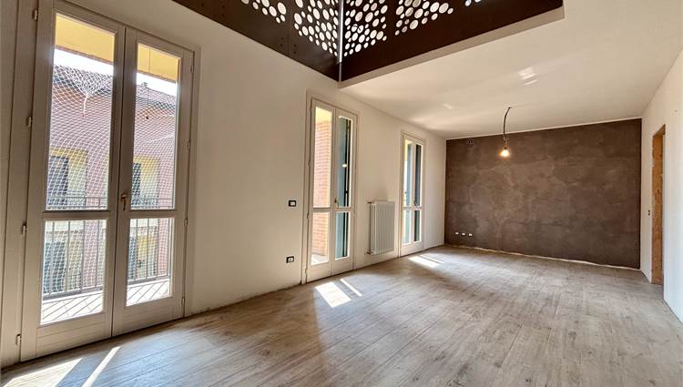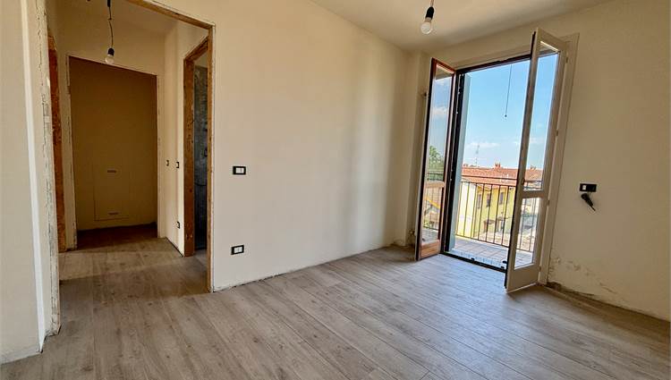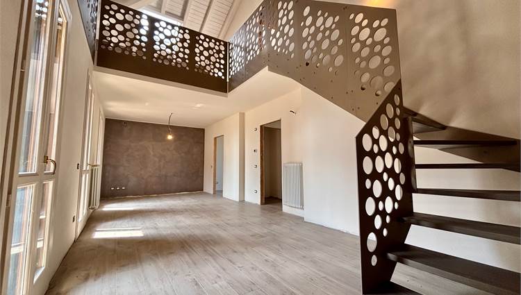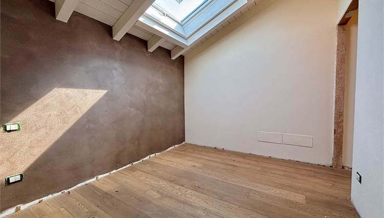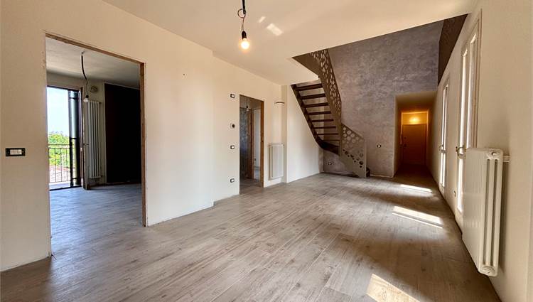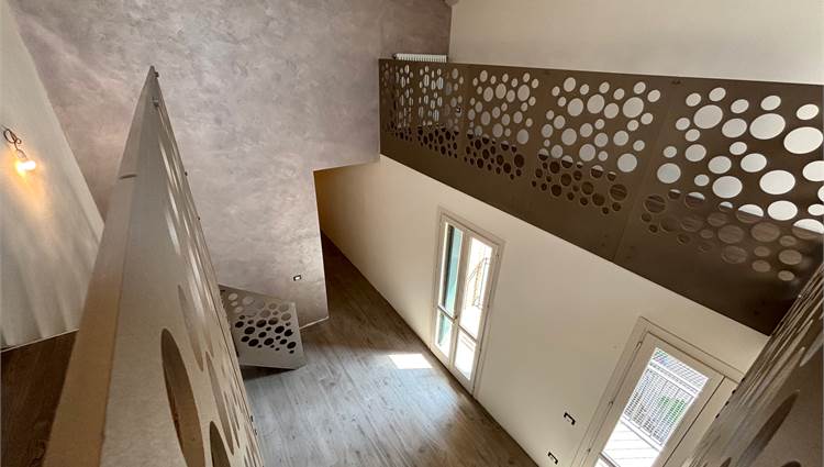 L'ingresso si apre su un soggiorno a doppia altezza, illuminato da vetrate e lucernari che inondano di sole ogni angolo e con accesso a un terrazzino vivibile. Grazie alle tre portefinestre, lo spazio rimane sempre arioso e in diretto dialogo con l’esterno, rendendo ogni giornata più luminosa. Completa la zona giorno la cucina abitabile – anch’essa con uscita su balcone – il bagno‑lavanderia finestrato e una prima camera matrimoniale di nuovo con balcone.