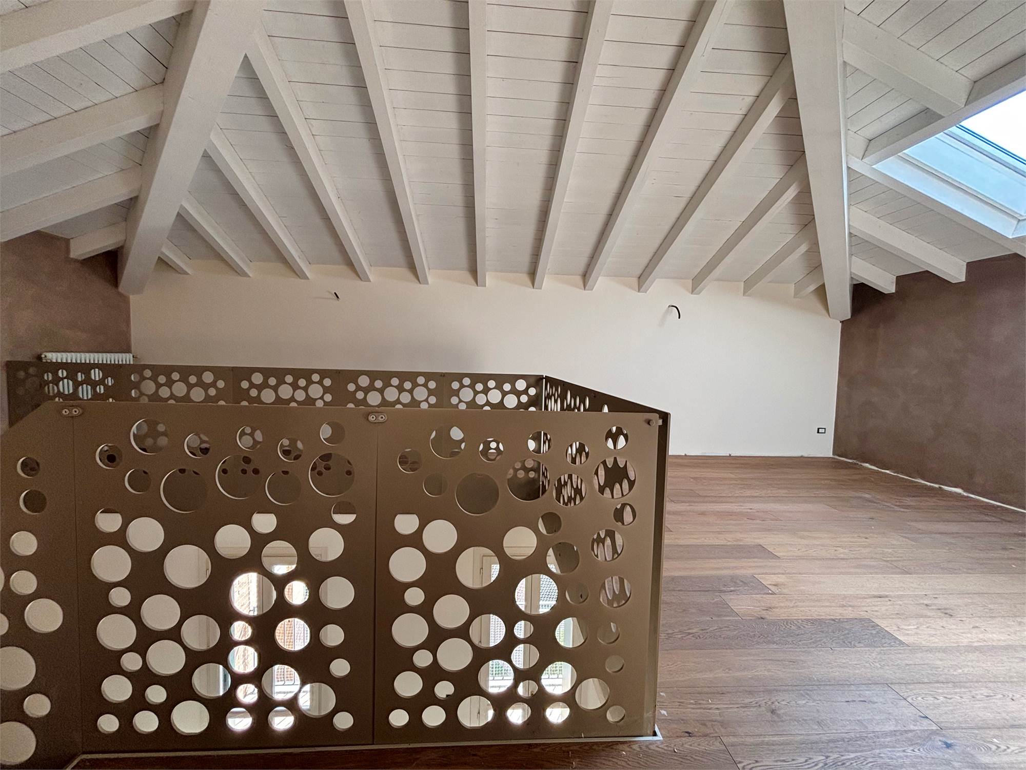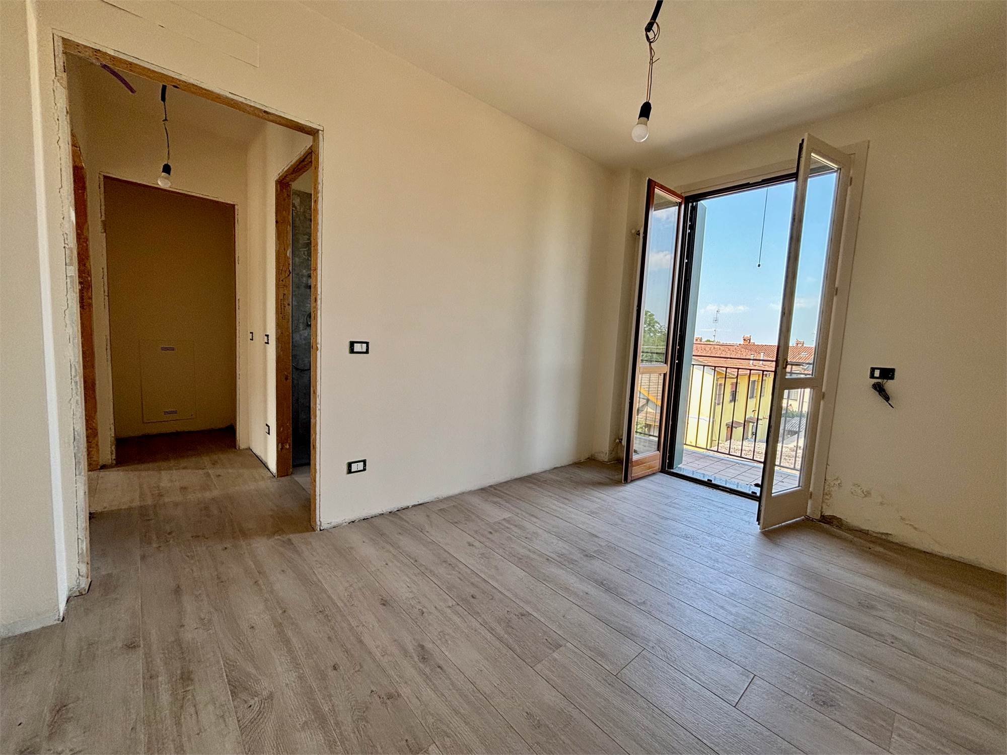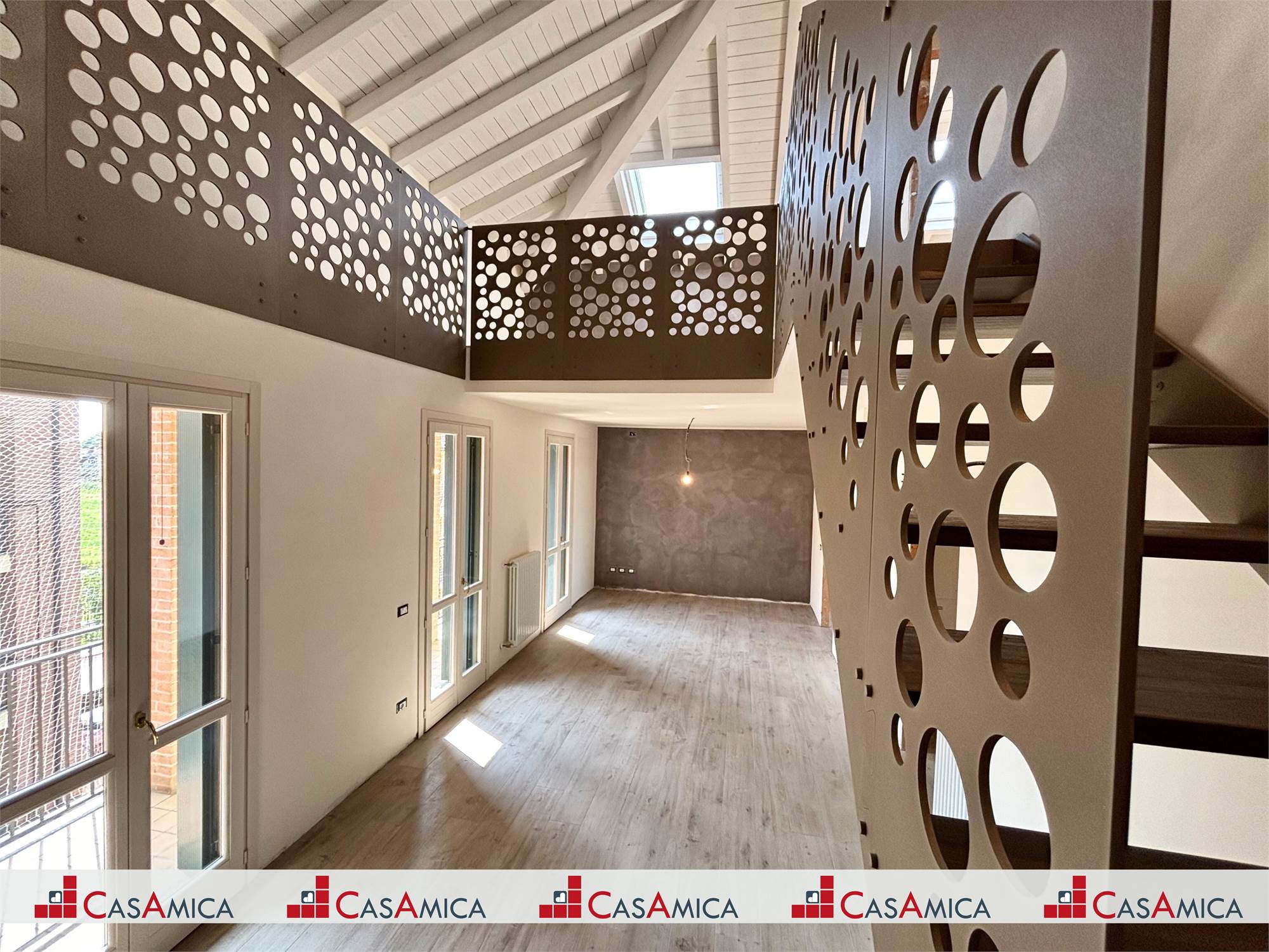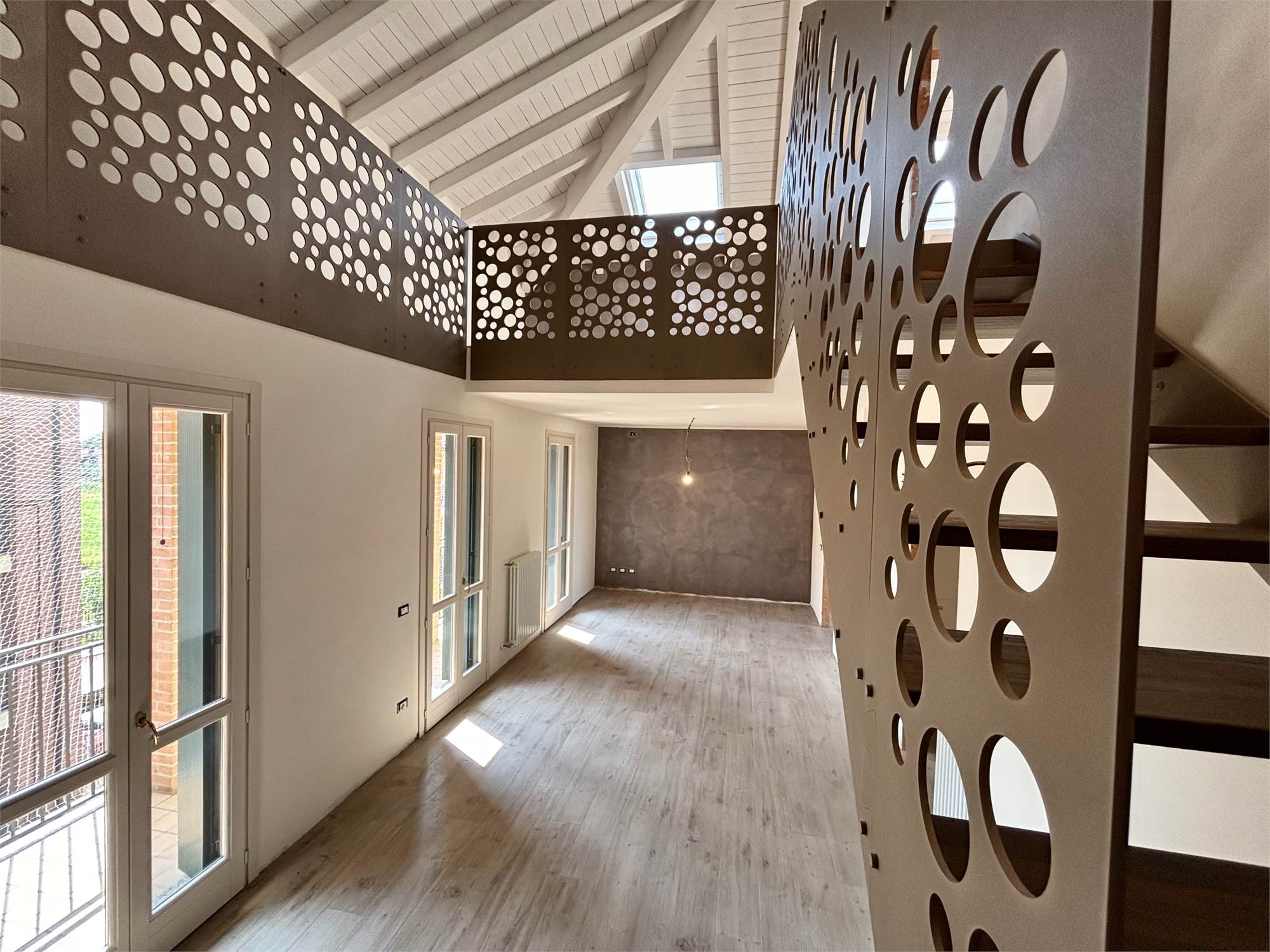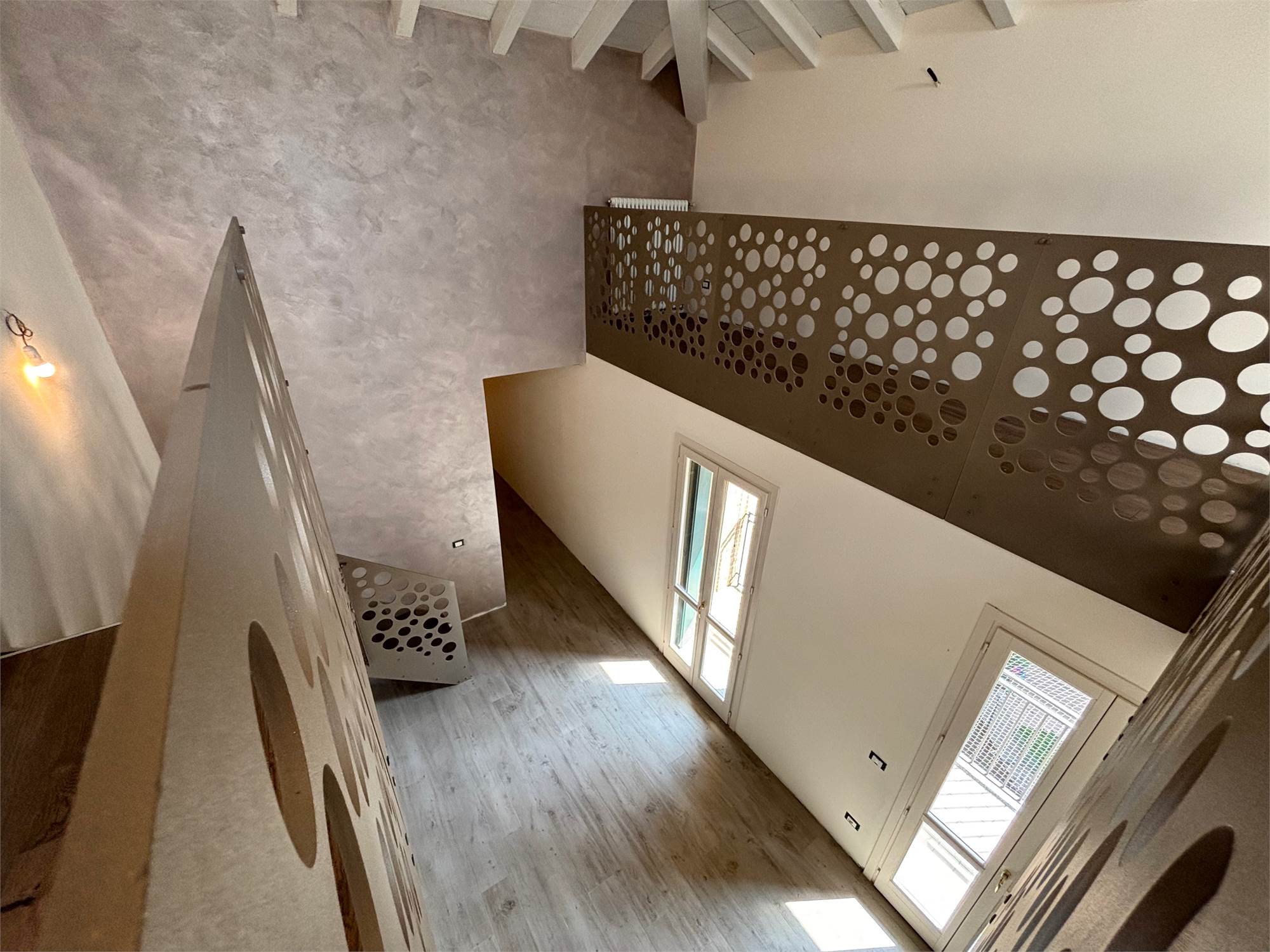 L'ingresso si apre su un soggiorno a doppia altezza, illuminato da vetrate e lucernari che inondano di sole ogni angolo e con accesso a un terrazzino vivibile. Grazie alle tre portefinestre, lo spazio rimane sempre arioso e in diretto dialogo con l’esterno, rendendo ogni giornata più luminosa. Completa la zona giorno la cucina abitabile – anch’essa con uscita su balcone – il bagno‑lavanderia finestrato e una prima camera matrimoniale di nuovo con balcone.