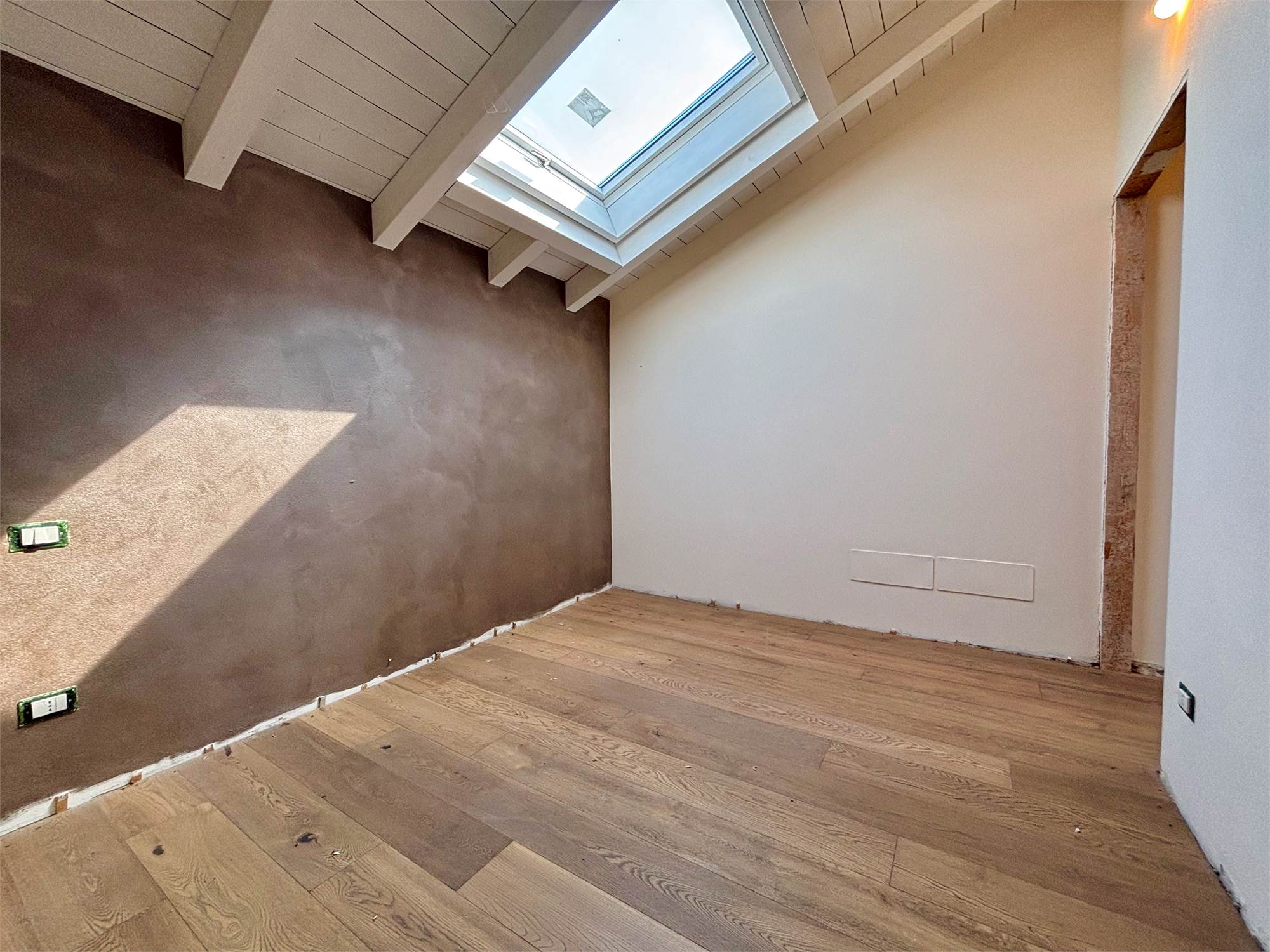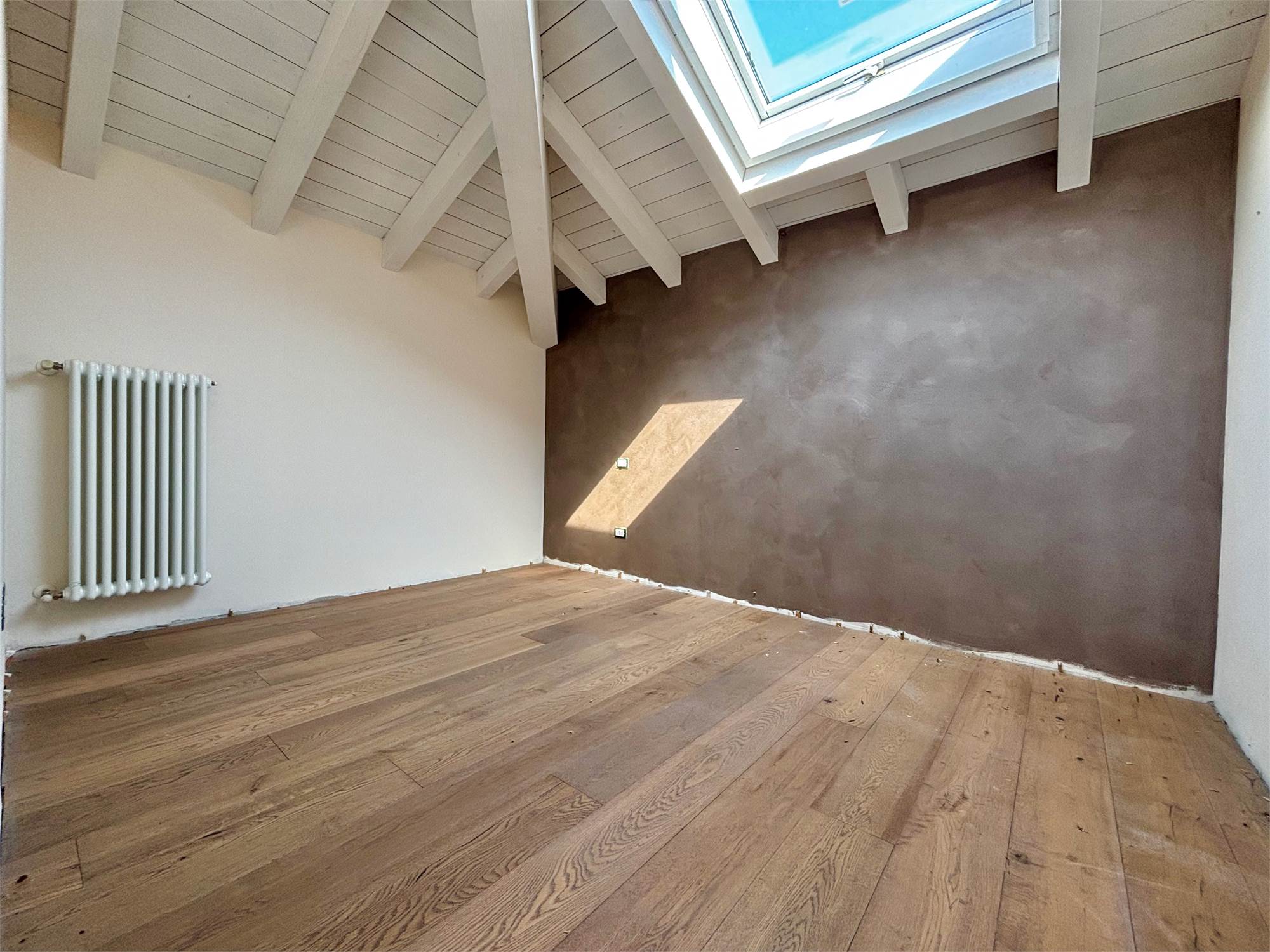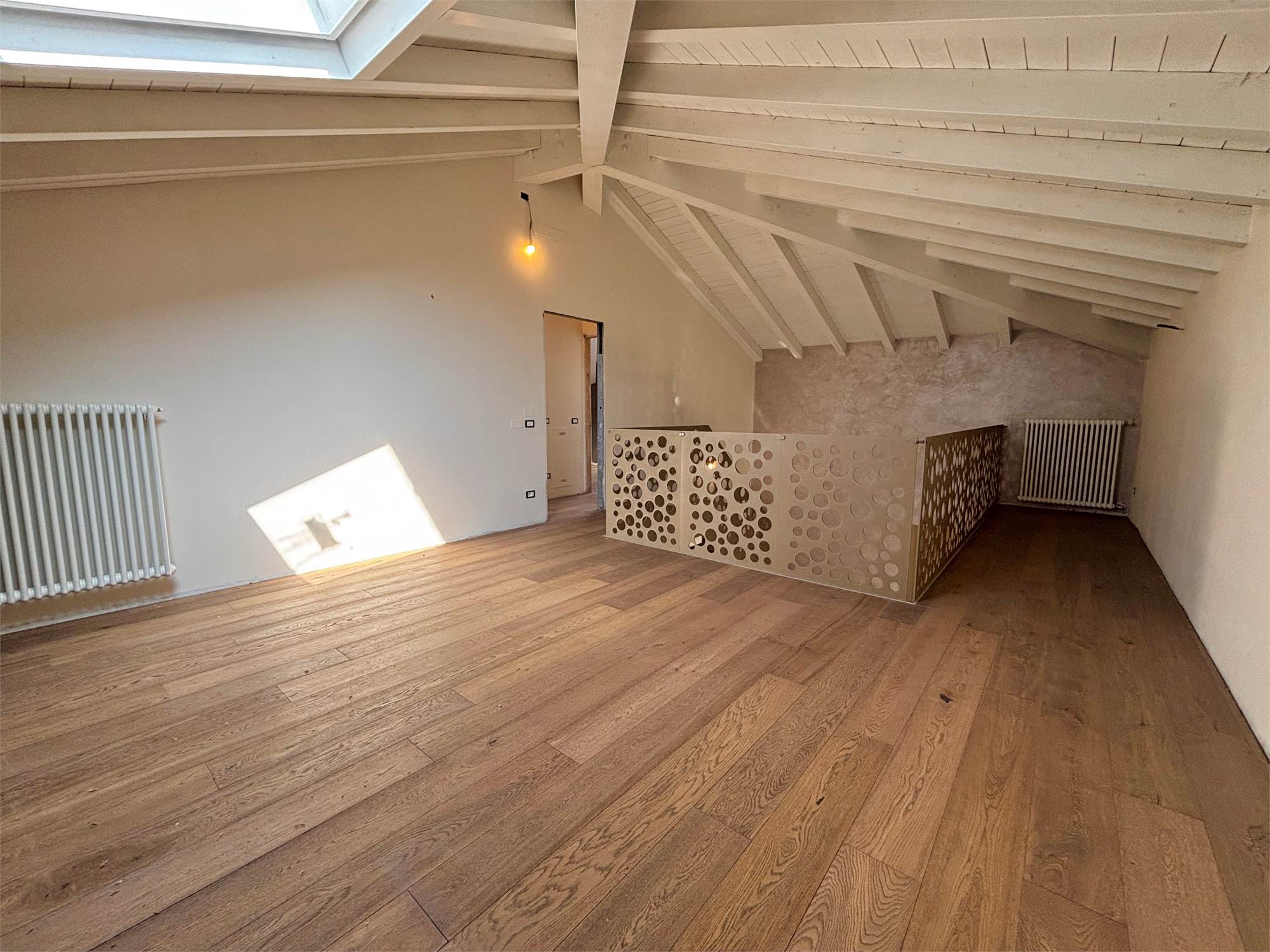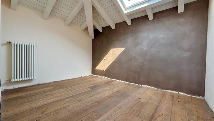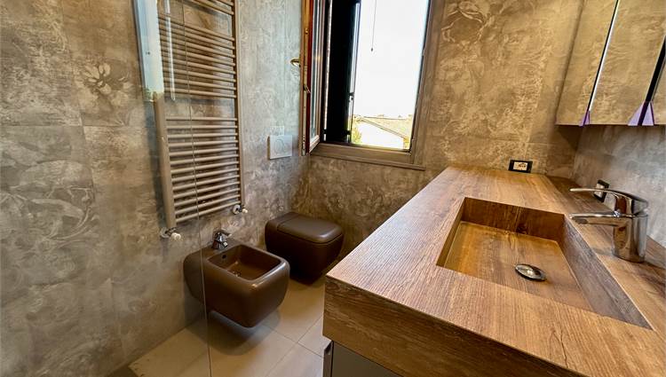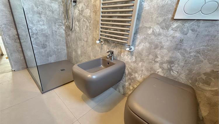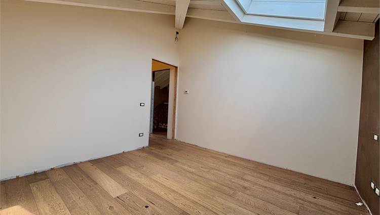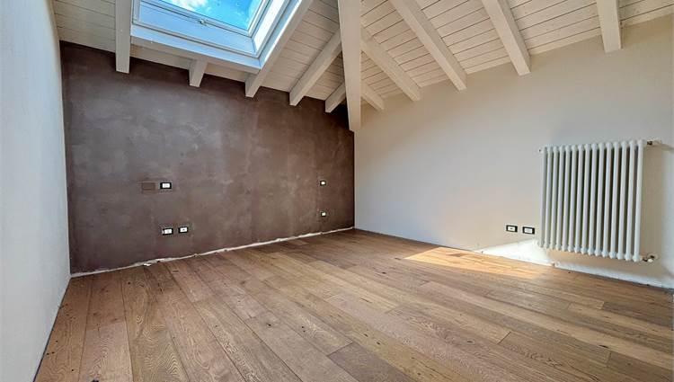 Da qui si accede anche ad altre due camere mansardate, arricchite da lucernari che regalano luce durante il giorno e, la sera, ti accompagnano mentre ti addormenti con lo sguardo rivolto alle stelle. A servizio della zona notte troviamo un secondo bagno completo con sanitari sospesi color tortora.