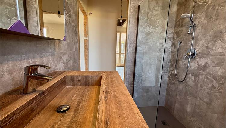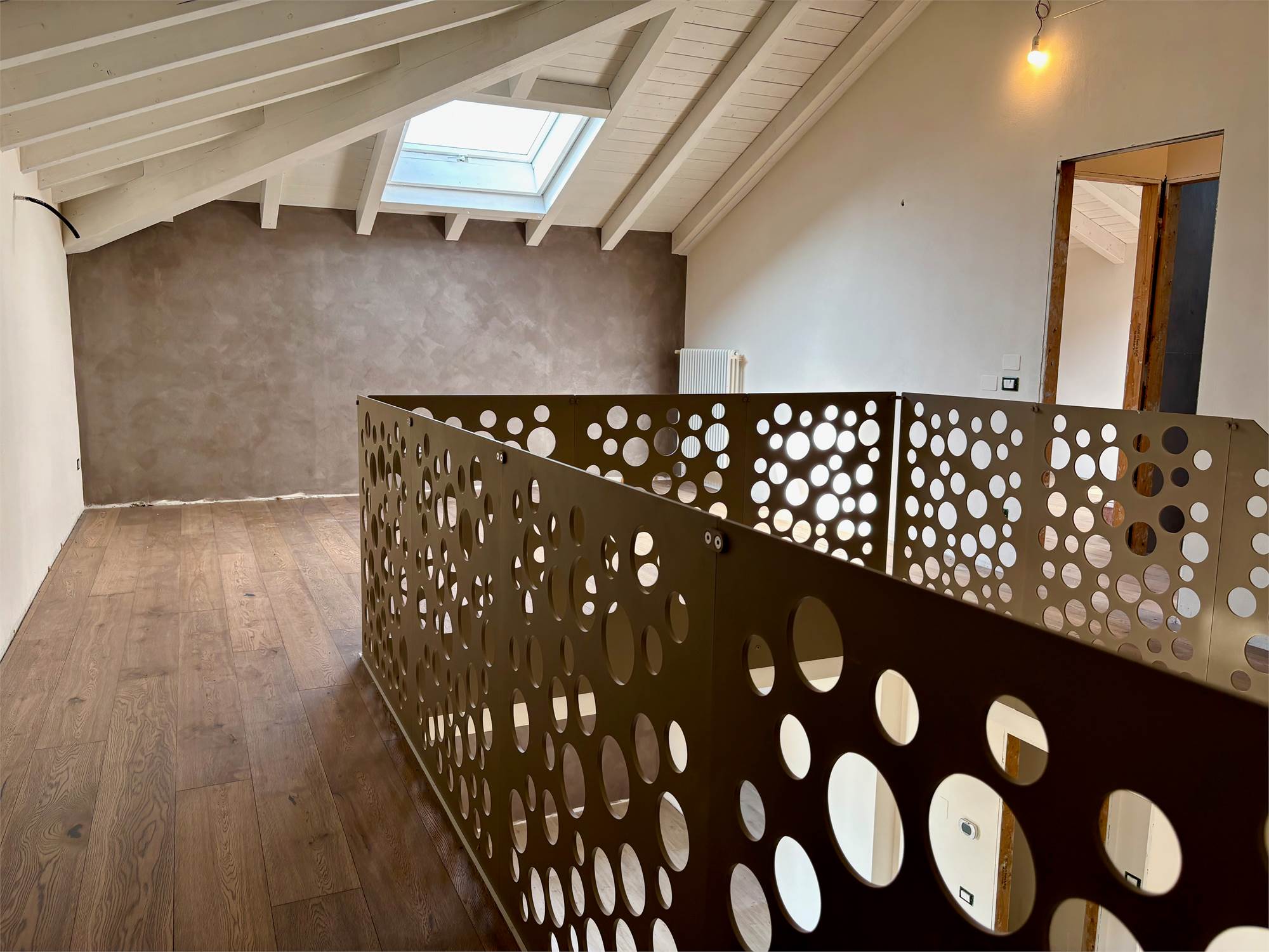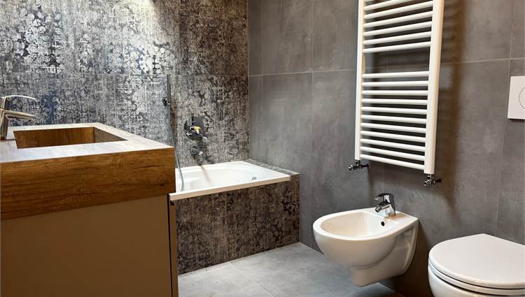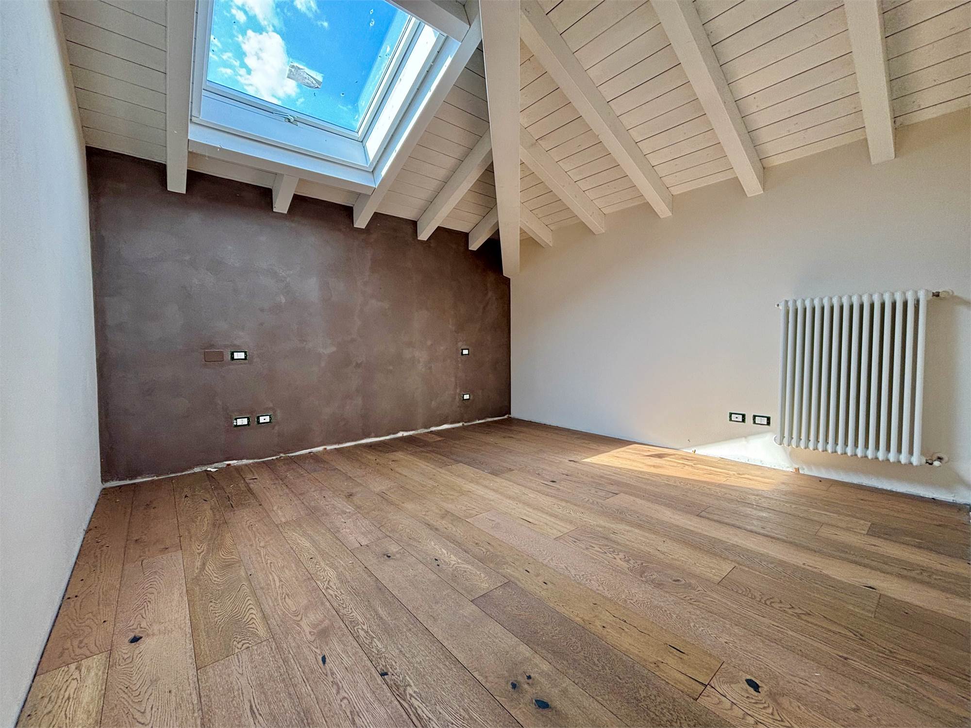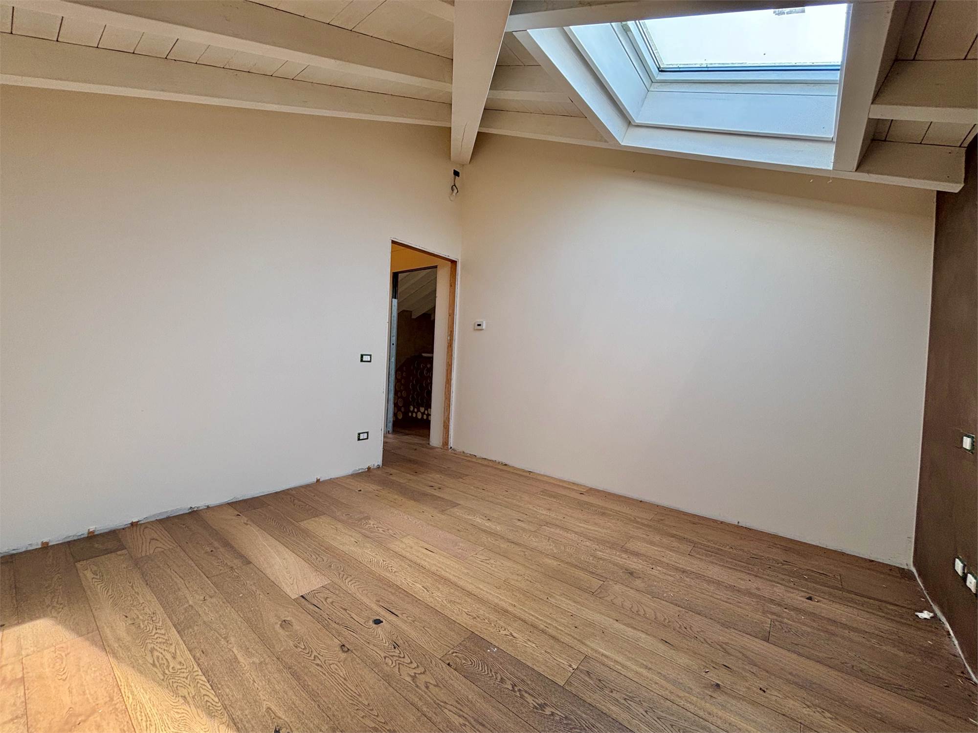 Da qui si accede anche ad altre due camere mansardate, arricchite da lucernari che regalano luce durante il giorno e, la sera, ti accompagnano mentre ti addormenti con lo sguardo rivolto alle stelle. A servizio della zona notte troviamo un secondo bagno completo con sanitari sospesi color tortora.