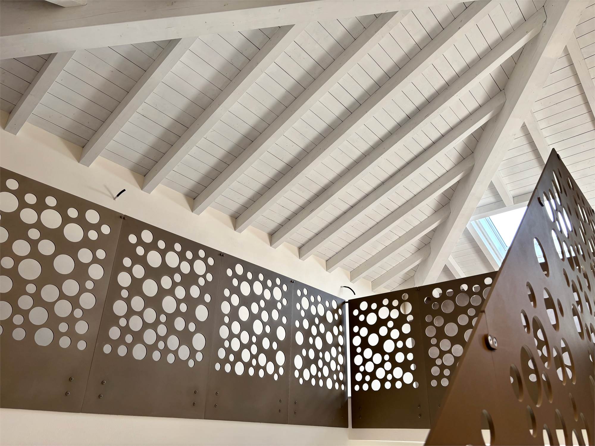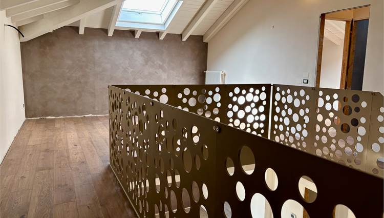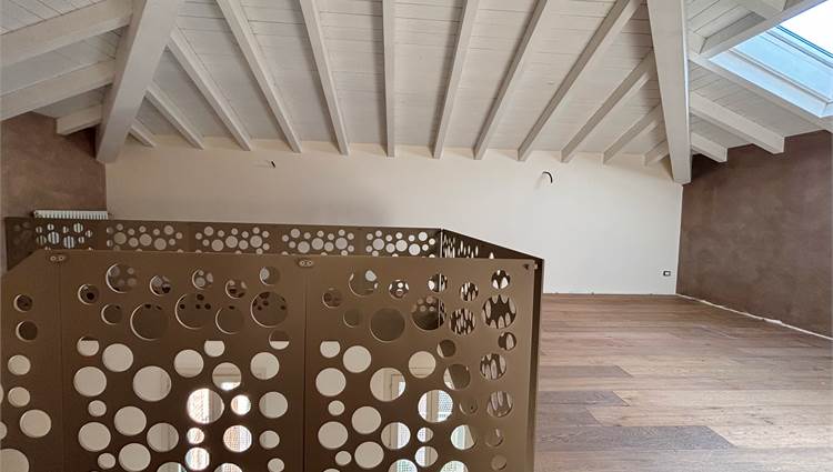 Una scala in legno di rovere spazzolato conduce al piano soppalcato: un secondo living multifunzione, protetto da parapetti di design in ferro brunito, con travi a vista e un’altezza generosa su tutto il piano, che ti consente di viverlo senza compromessi, muovendoti liberamente e senza mai il timore di urtare la testa. Uno spazio pensato per adattarsi al tuo stile di vita: studio per lo smart working, angolo lettura, zona relax o ambiente giochi per i più piccoli.